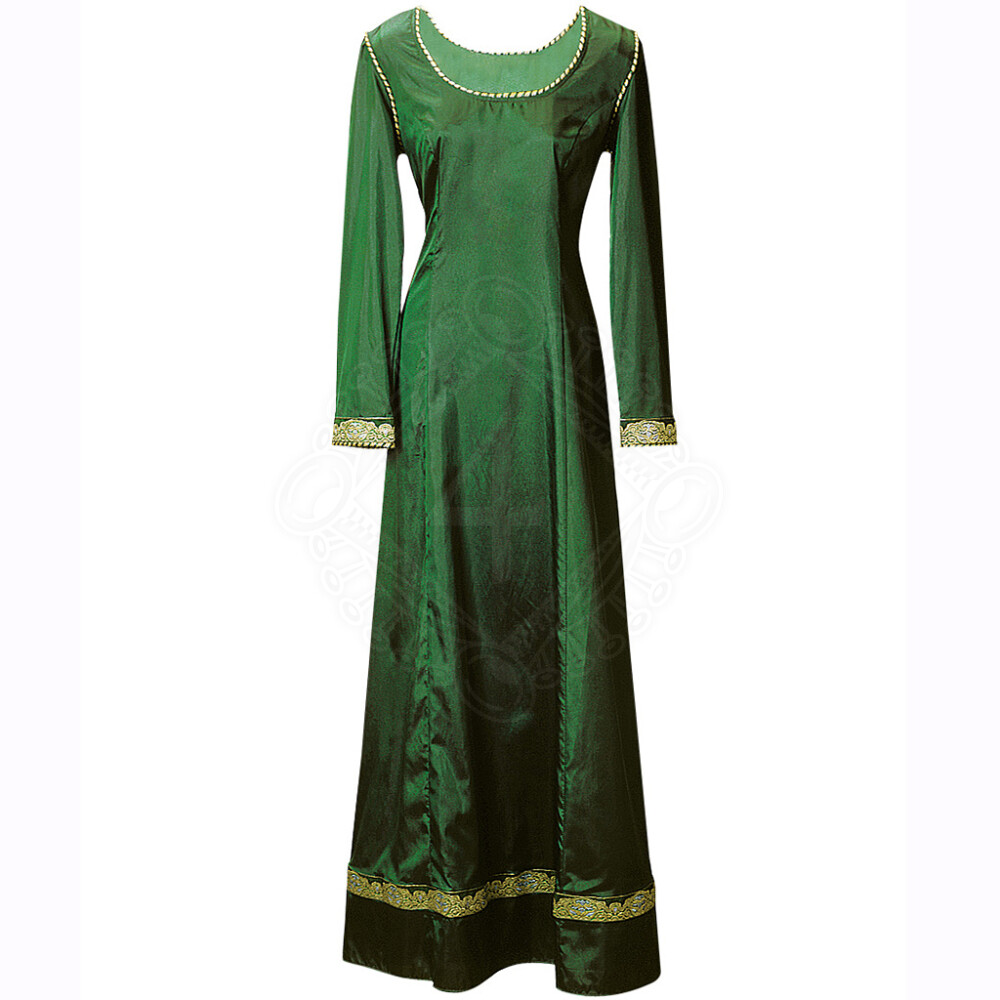 Tyto lehké letní šaty z jemné nemačkavé látky září na světle jako smaragd. Široké zlaté ozdobné lemy zdobí sukni a dlouhé rukávy. Úzký zlato-zelený kordel zdůrazňuje výstřih a průramky, na zádech je ozdobné šněrování. Šaty se snadno oblékají přes hlavu a okouzlí strohou elegancí a štíhlým střihem. Více informací k produktu ...