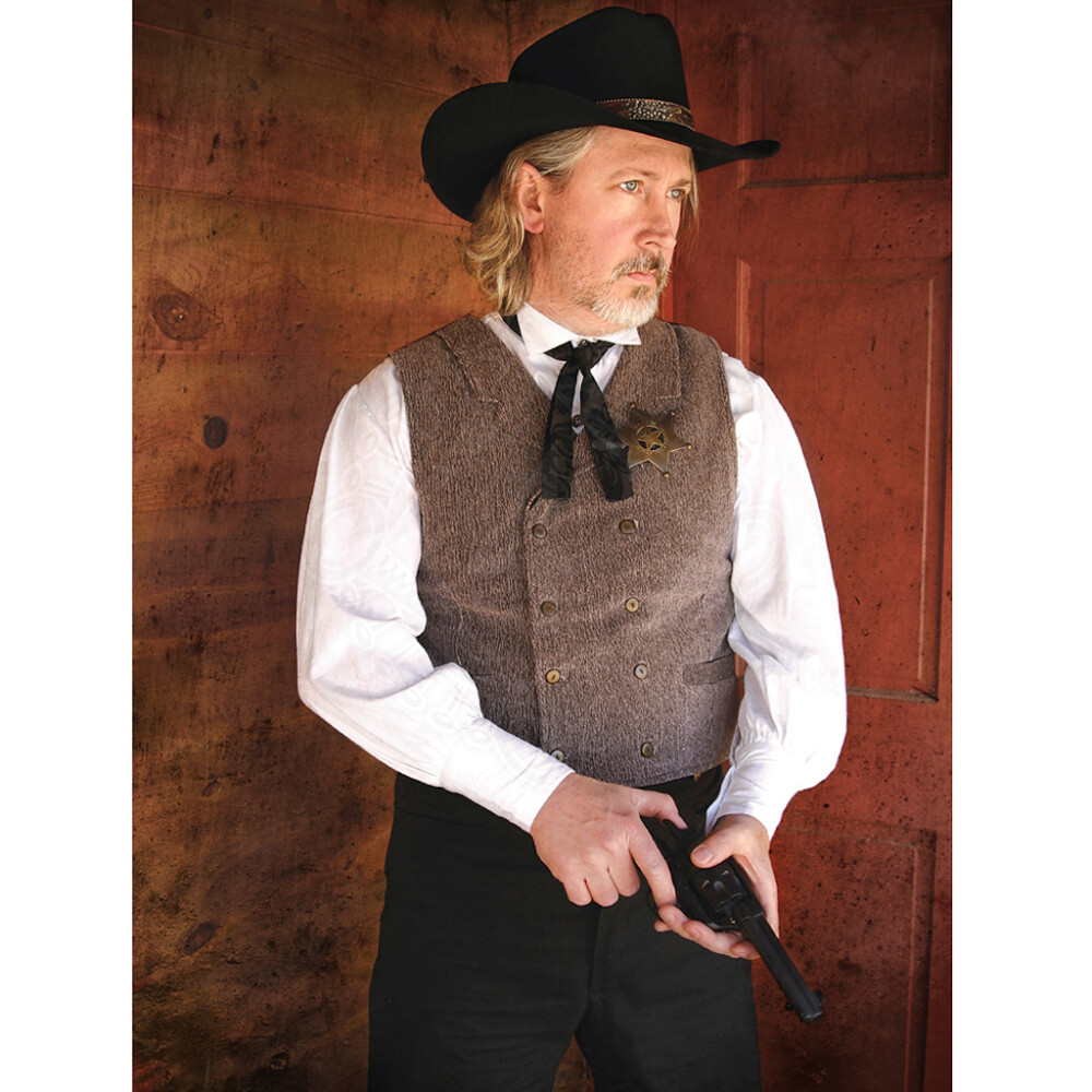 Ať dobytkářský baron, majitel pozemku, lékárník nebo šerif, každý z nich by mohl oblékat naši dvouřadou elegantní vestu. Oba přední díly se překrývají a jsou uzavřeny dvěmi řadami knoflíků. Krátky střih je praktický zvláště při jízdě na koni. Na předním díle jsou dvě funkční kapsy. Více informací k produktu ...