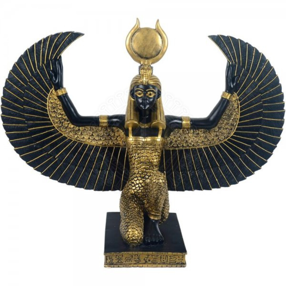 Isis byla dobrá a spravedlivá staroegyptská bohyně, která se těšila veliké oblibě. Lidé ji věrně uctívali zejména pro její věrnou manželskou lásku, lásku k dětem, její ušlechtilosti a kráse. Postava bohyně byla znázorňována různými způsoby. Více se dozvíte v našem článku o této egyptské bohyni. Socha bohyně Isis s křídly stojí na černém soklu s nejrůznějšími hieroglyfy, je celá černá, zdobené zlatavou barvou.