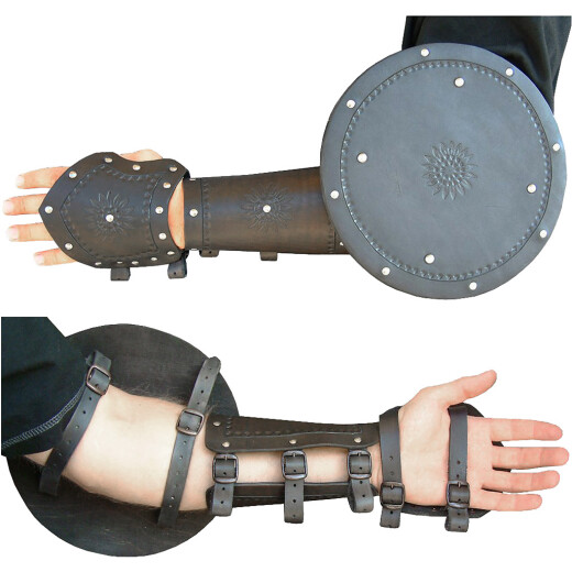 Tento výrobek se skládá z chrániče předloktí, chrániče hřbetu ruky a kruhového štítu, který chrání loket. Chránič předloktí a chránič hřbetu ruky je vyroben z hovězinové hlazenice o síle do 3,5mm. Chrániče jsou po celé ploše zdobeny ornamenty. Dále jsou zkrášleny ozdobnými nýty. Chránič předloktí se zapíná pomocí dvou pásků se sponou. Délka chrániče předloktí je 12cm. Délka chrániče hřbetu ruky je 9cm. Více informací k produktu ...