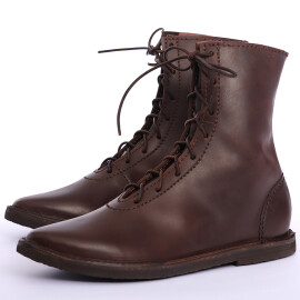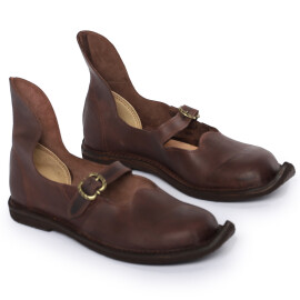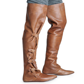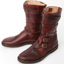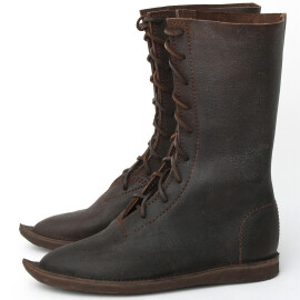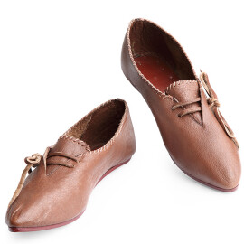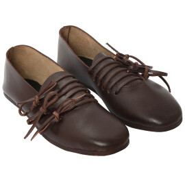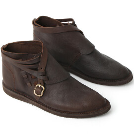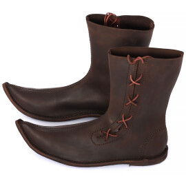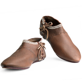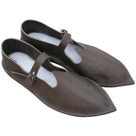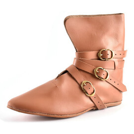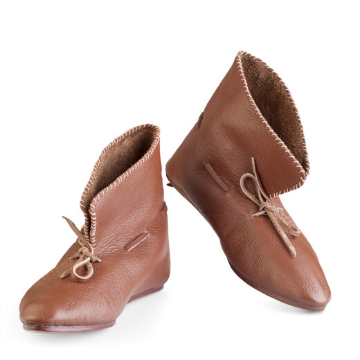 2xTyto středověké nízké boty s přeloženou manžetou lze nosit i venku. Jedná se ale o repliku historické obuvi, takže nelze očekávat vlastnosti moderní obuvi, zejména co se týká odolnosti proti vlhkosti. Pokud boty během používání navlhnou nebo je promočíte, nechte je na dobře větraném místě zcela osušit, okartáčujte nečistoty a ošetřete prostředky na koženou obuv. Vodoodpudivými prostředky na koženou obuv doporučujeme boty ošetřit ještě před prvním použitím. Více informací k produktu ...