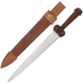 Der leichte, fertigungsbedingte Achsversatz beim Befestigen der Angel im Griff wurde etwas mit der Messingrosette kaschiert. An der Dolchscheide fehlt leider eine Gürtelschlaufe (Verbesserungsvorschlag).