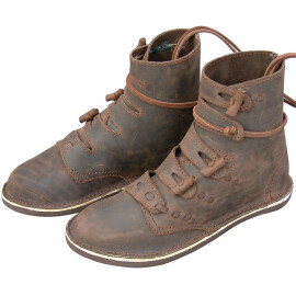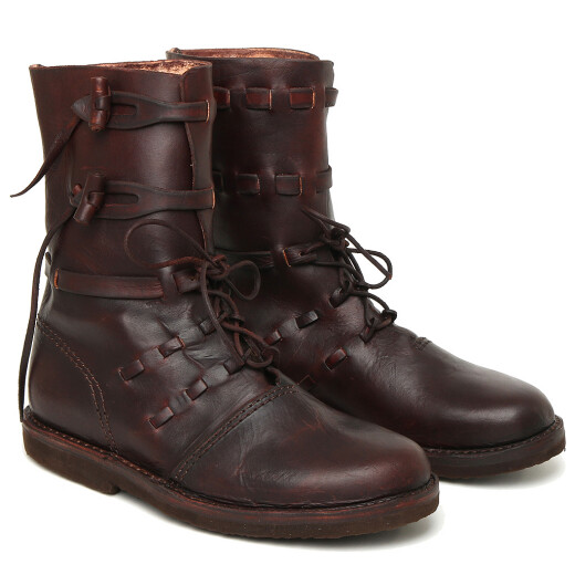 Pevná nadkotníková obuv stahovaná v nártové části třemi páry řemenů a v holeňové části zapínaná na knoflíky. Více informací k produktu ...