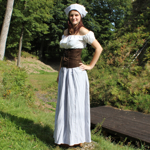 Gotická šenkýřka Fedora se skládá z bavlněné košilky, která se dá nosit s odhalenými nebo zakrytými rameny. Součástí kostýmu šenkýřka je šněrovaný živůtek, sukně a čepeček s límcem ze stejného materiálu, jako je sukně. Více informací k produktu ...