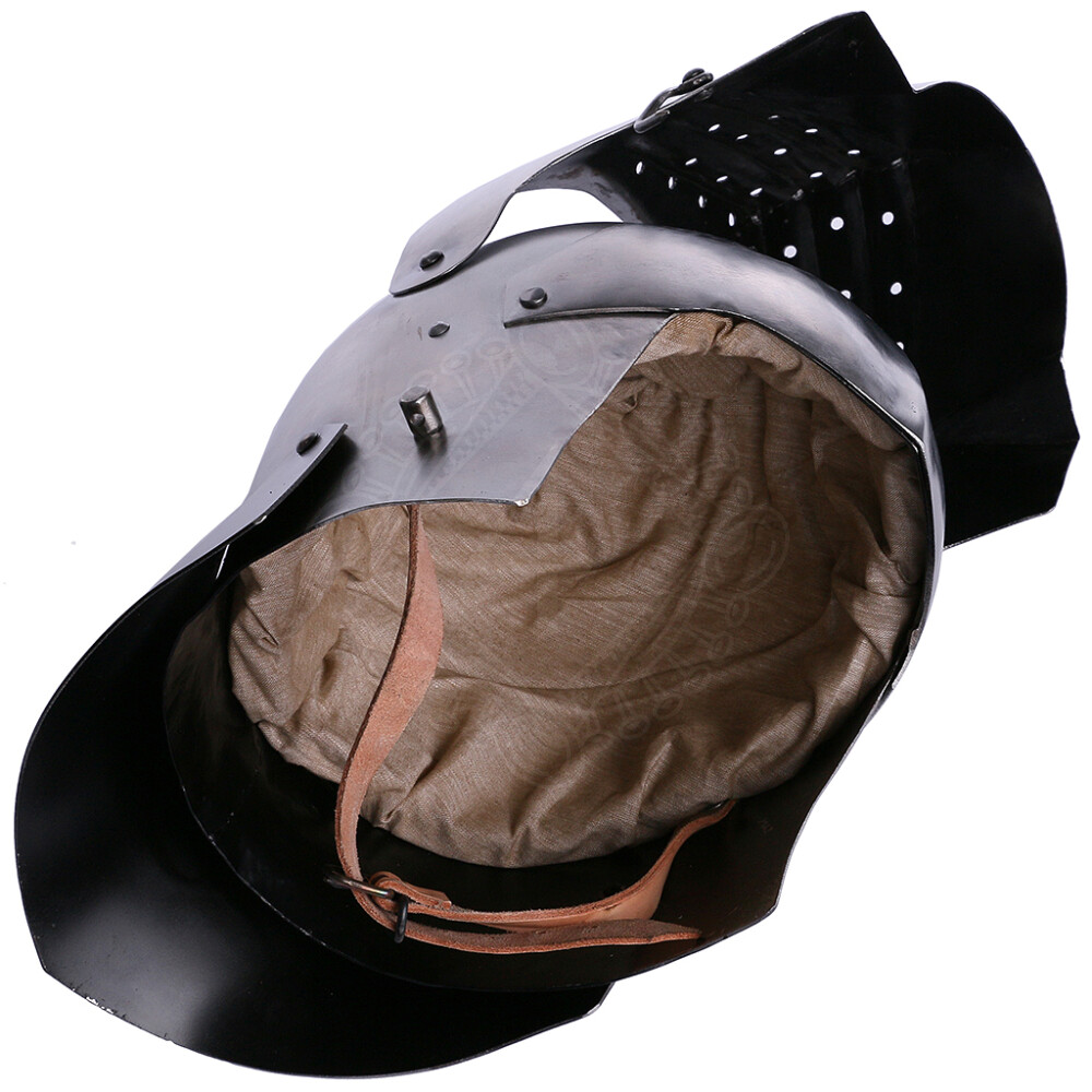 Pozdní šalíř je vybavena koženým řemenem pod bradu. Skutečná tloušťka oceli se může lehce lišit vzhledem ručnímu způsobu výroby. Přilba je vybavena vnitřní plátěnou výstelkou a koženým řemenem pod bradu.
