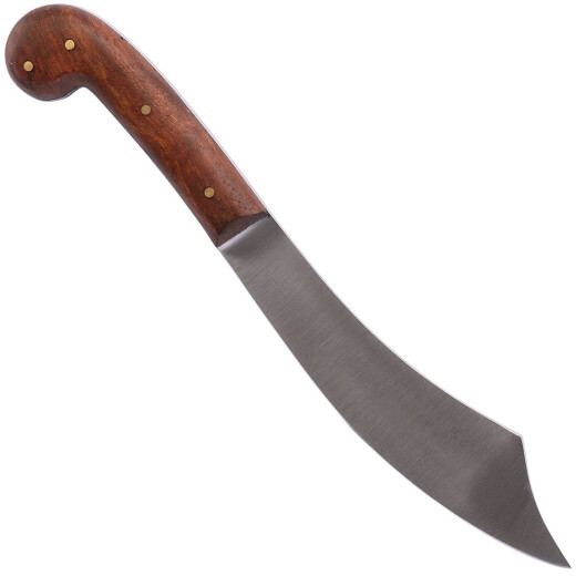 V dobových kázáních (např. od sv. Vincenta Ferrerského) se dočteme, že nůž byl běžnou součástí výbavy i dětí, které jej dostávaly od rodičů. Byla to nutnost. Tento model má robustní čepel, která se směrem ke špičce rozšiřuje, což zvyšuje pádnost při seku. Rukojeť z tvrdého dřeva se na konci výrazně zahýbá dolů. Tento ergonomický prvek (často vídaný u dobových tesáků) zajišťuje, že ti nůž nevyklouzne z ruky ani při silném seknutí nebo práci s mastnýma rukama.