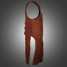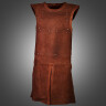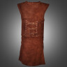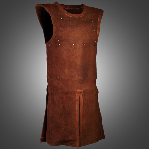 Základem zbroje je pevná semišová kůže, pod kterou jsou nanýtovány ocelové pláty. Tato kombinace ti zajistí solidní ochranu proti úderům. Velkou výhodou tohoto modelu je jeho přizpůsobivost. Díky systému řemenů a přezek na zádech a na bocích si můžeš kabátec utáhnout přesně podle své postavy a vrstev oblečení, které máš pod ním. Spodní část je dělena rozparky, což ti umožní pohodlný pohyb nohou, ať už běžíš do útoku, nebo sedíš v sedle.