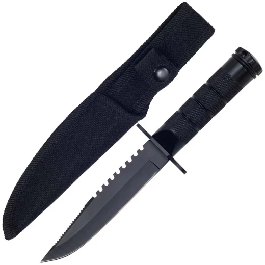 Černěná čepel je vyrobená z nerezové oceli 420, rukojeť je z lehkého kovu. Koncovku rukojeti lze odšroubovat. Zde je zasazený kompas, v dutině rukojeti se nachází další potřeby na přežití. Délka čepele je 110mm a celková délka nože je 205mm. Více informací k produktu ...
