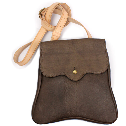 Dobová cestovní kabela přes rameno je vyrobena z jelení usně hnědé barvy. Nosný řemen kabely je vyroben z hovězinové usně o síle do 3,5mm. Zapínání je vyřešeno pomocí bronzového knoflíku, který je ručně zašitý v předním díle kabely. Klopna je zdobena ražbou stylových ornamentů. Tato poutní brašna podle Wagnera se nosí přes rameno.