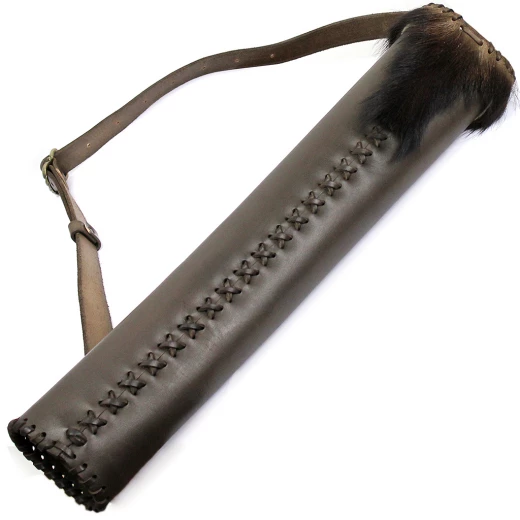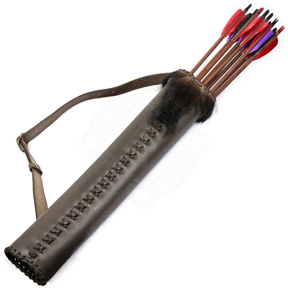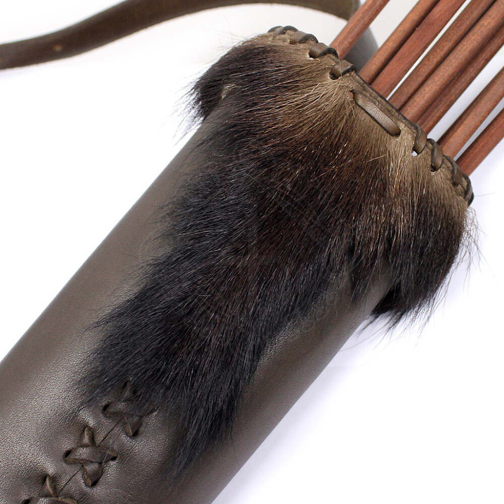 Na horní okraj toulce je našita ozdoba z kožešiny lovné zvěře. Kožený toulec na šípy má průměr cca 9cm a pojme cca 15-20ks. Je vhodný i pro ostré šípy.