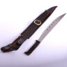 - Plně průchozí čepel (full tang) obložená silnou kůží a ovinutá koženým řemínkem