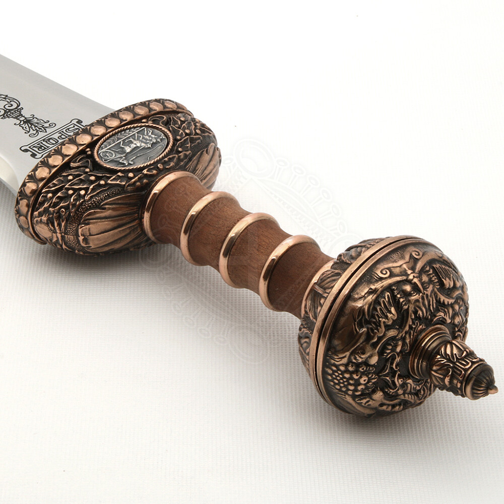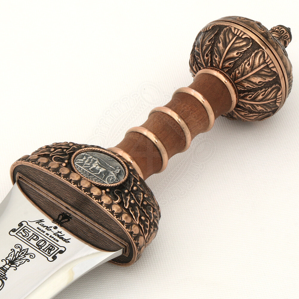 Jílec je skutečným uměleckým dílem. Záštita a hlavice jsou odlity ze slitiny Zamak s povrchovou úpravou v odstínu starého bronzu a mědi. Na záštitě nalezneš detailní medailon vyobrazující římský válečný vůz, zatímco zbytek kování zdobí reliéfy listoví a orlů. Rukojeť je anatomicky tvarovaná a prokládaná segmenty z pravého tvrdého dřeva, což zajišťuje nejen autentický vzhled, ale i příjemný úchop.