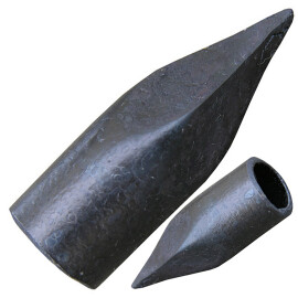 Hrot je opatřen tulejí (dutinkou). Pro nasazení budeš muset konec dřevěného dříku (týbla) ořezat do kónického tvaru. Pro pevné spojení doporučujeme použít vhodné lepidlo (historicky smůlu či březový dehet, dnes postačí dvousložkové epoxidové lepidlo) a případně hrot zajistit malým hřebíčkem, pokud to průměr dovolí, nebo pouze lepením.