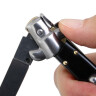 Čepel nože je uložená na pružině. Po stlačení knoflíku na střence vyskočí čepel z rukojeti, do přímé pozice je však třeba čepeli pomoci rukou. V přímé pozici drží čepel včelková západka na čepu. Čep je v jednom kuse s čepelí. Pokud chcete nůž opět zavřít, je nutné zatlačit na jednu ze záštit na čelisti kloubového uložení čepele (viz detailní foto  s palcem). Dojde tak ke zdvižení západky z čepu. Poté můžete čepel zaklapnout zpět do rukojeti. Aby se nůž samovolně neotevřel při tlaku na knoflík, je na rukojeti ještě druhý – menší knoflík ovládající posuvnou pojistku, jíž otevírací mechanismus zajistíte.