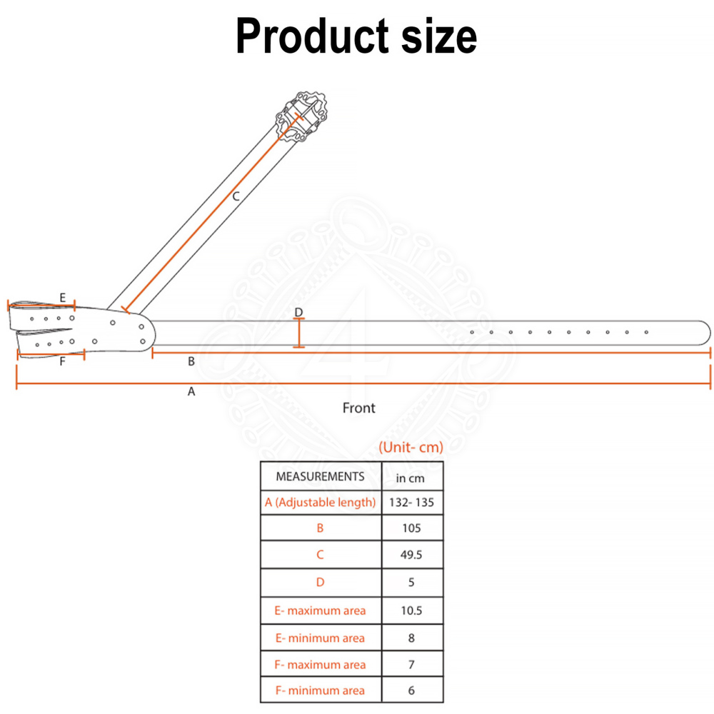 To, co dělá tento bandalír skutečně praktickým, je nastavitelný závěs na pochvu (žabka). Ten je tvořen systémem poutek spojených šroubovacími nýty. Pomocí plochého šroubováku si můžeš nastavit sevření tak, aby přesně odpovídalo šířce a obvodu pochvy tvého meče. Zbraň tak bude pevně držet na svém místě a nebude se při chůzi zbytečně kývat.