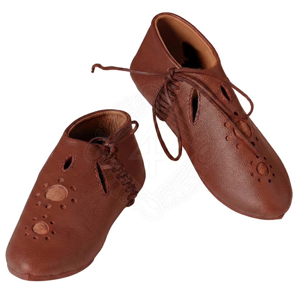 Přemýšlíš, kde se vzal tento neobvyklý design s kruhovými a kapkovitými výřezy na nártu? Předlohou pro tuto obuv se staly unikátní nástěnné malby v katedrále ve španělském Teruelu, které pocházejí ze 13. století. Na jedné z těchto fresek je jasně vyobrazen střelec z kuše (kušník), který právě napíná svou zbraň pomocí třmenu, a na nohou má obuté přesně tyto polobotky s prořezávaným vzorem. Výřezy v kůži měly ve středověku nejen estetickou funkci, ale pravděpodobně i praktickou – umožňovaly noze v horkém podnebí Pyrenejského poloostrova lépe dýchat. Z hlediska konstrukce odpovídají tehdejším obuvnickým postupům a jsou opatřeny praktickým bočním šněrováním.