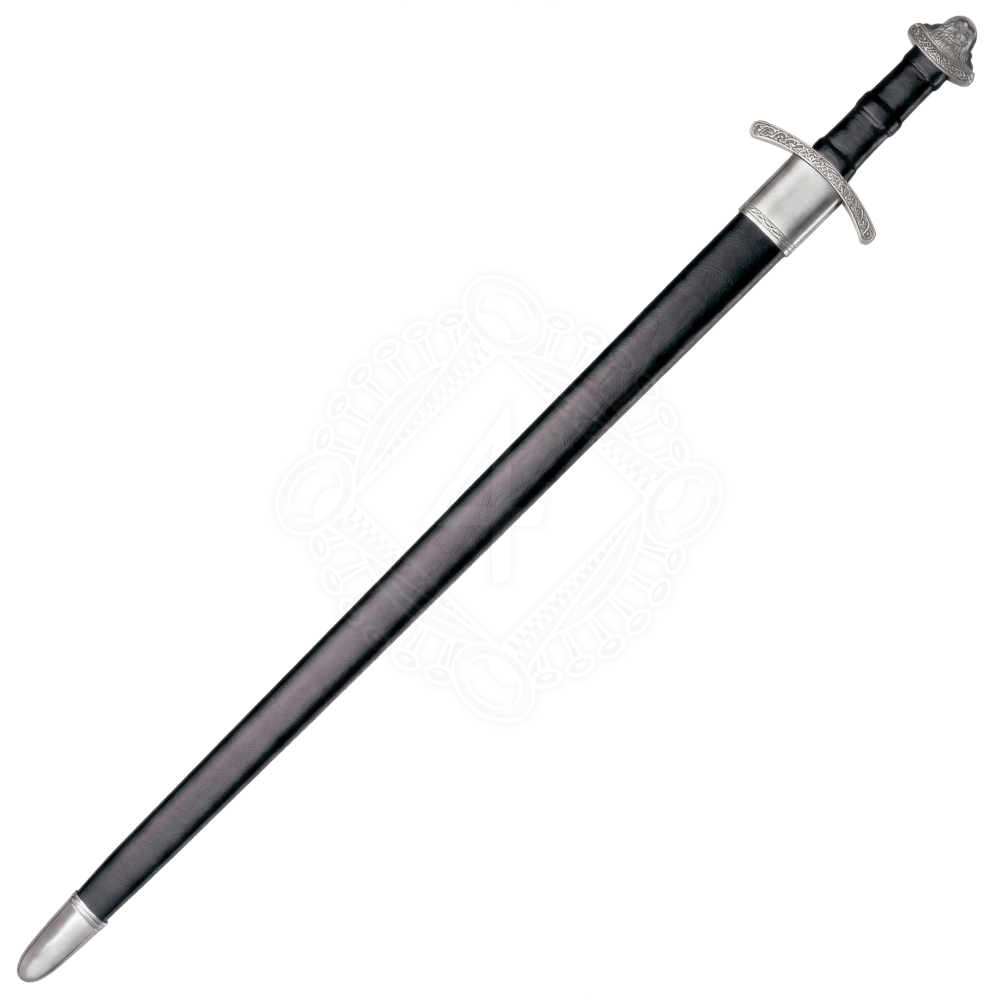 Tento meč vychází z designu historických zbraní skandinávských válečníků z 9. a 10. století, které lze zařadit do známé Petersenovy typologie vikinských mečů. Pro tyto zbraně byla typická dlouhá a široká čepel s výraznou středovou drážkou (žlábkem), jež snižovala hmotnost, aniž by ubírala na pevnosti. Primární technikou v tehdejším štítovém boji bylo drtivé sekání, nicméně hrot zůstával dostatečně ostrý i pro účinný bod. Jílec je osazen jednodušší, mírně vpřed prohnutou záštitou a masivní hlavicí s pěti laloky. Tato těžká hlavice sloužila jako dokonalá protiváha k dlouhé čepeli, což zajišťovalo skvělou ovladatelnost zbraně. Rukojeť je vyrobena ze dřeva a pevně ovinuta kvalitní kůží pro jistý úchop. Záštita i hlavice jsou navíc precizně zdobeny spletitým keltsko-severským ornamentem.