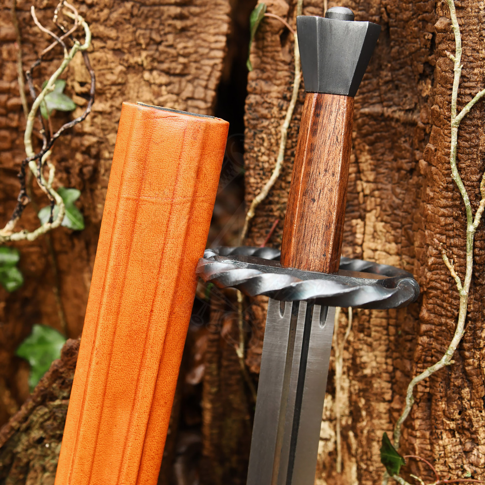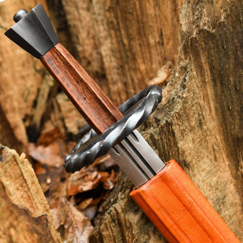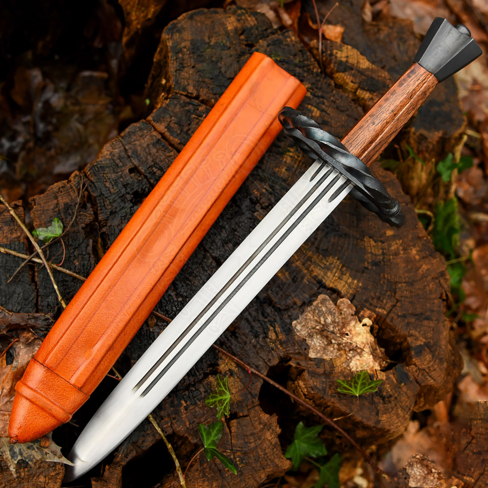 Tato dýka není jen obyčejným nožem; je to zmenšená verze slavného meče Katzbalger, který byl navržen pro boj v nejhustší vřavě, kde dlouhé zbraně selhávaly. Čepel o šířce 5 cm je vyrobena z kvalitní oceli a u záštity ji zdobí tři hluboké žlábky (fullery), které snižují hmotnost, aniž by ubíraly na pevnosti. Dominantou zbraně je masivní esovitá záštita (ve tvaru osmičky), která je u tohoto modelu vyrobena z krouceného železa. Tento prvek nesloužil jen k okrase, ale především k zachycení čepele soupeře v těsném kontaktu. Rukojeť z tvrdého dřeva plynule přechází v osmihrannou ocelovou hlavici, která vyvažuje celou dýku a v nouzi může posloužit jako úderová plocha. Součástí dodávky je také ručně šitá kožená pochva, která doplňuje celkový historický dojem.