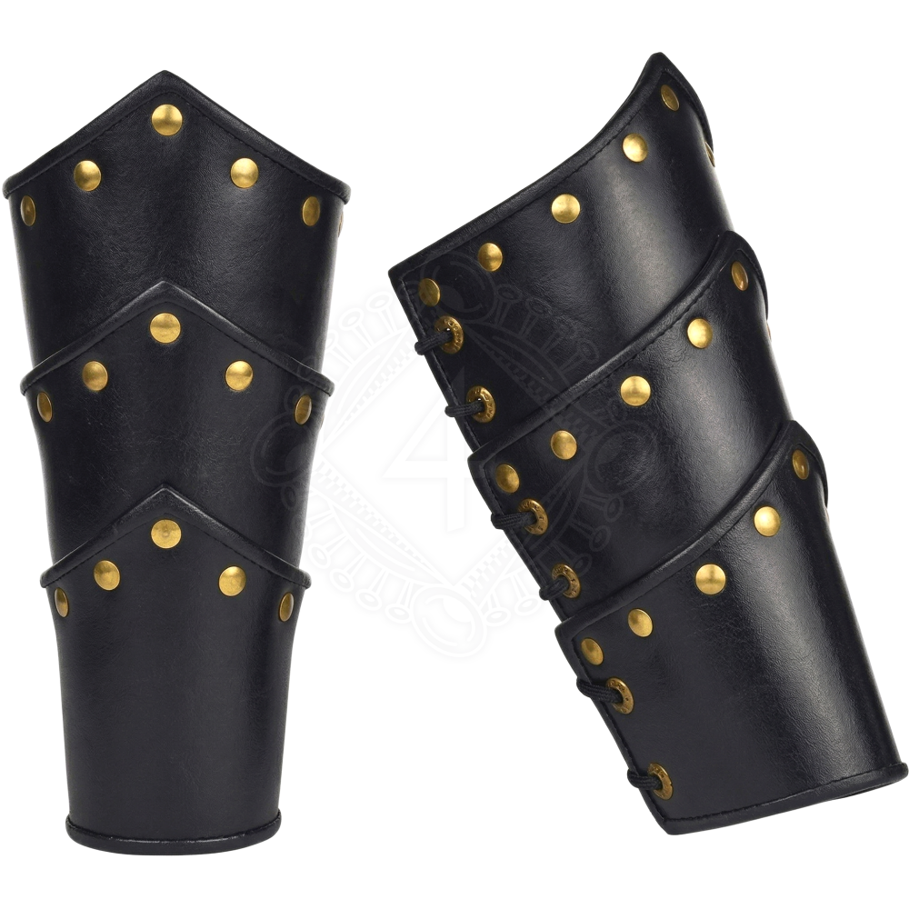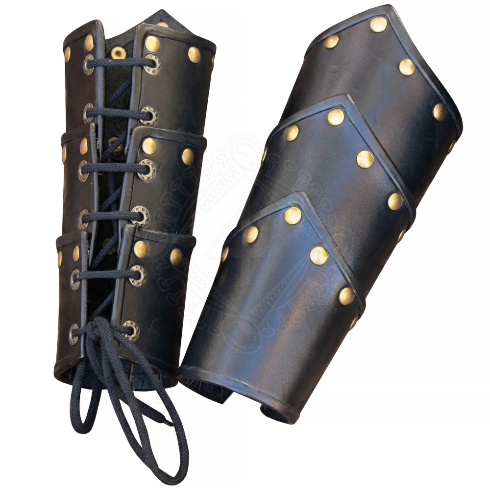 Nátepníky jsou navrženy tak, aby ti poskytly maximální komfort. Jsou složeny ze tří samostatných segmentů, které jsou k sobě pevně spojeny mosaznými nýty. Horní okraj směřující k lokti je stylově zašpičatělý, což nejen skvěle vypadá, ale také to opticky prodlužuje ruku a dodává zbroji na dynamice. Zadní strana je opatřena řadou oček s protahovací šňůrkou, díky čemuž si nátepníky dokonale přizpůsobíš tloušťce svého předloktí, ať už je nosíš na holé kůži nebo přes rukávy prošívanice či tuniky.