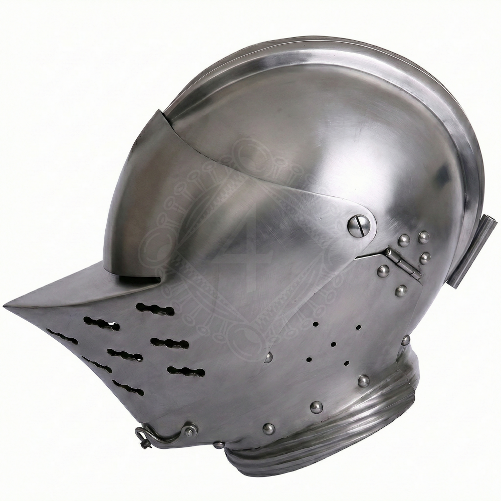 Tato přilba je vyrobena z konstrukční oceli o síle přibližně 1,1 mm, což z ní činí poměrně lehkou, ale vizuálně autentickou repliku. Označení „uzavřená přilba“ (Close Helm) či Armet odkazuje na její unikátní konstrukci, která zcela obepíná hlavu a krk a poskytuje tak maximální ochranu.