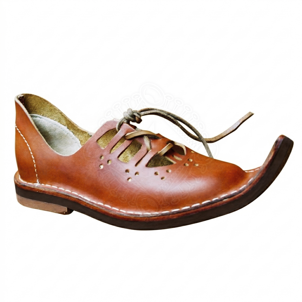 Zatímco vysoká šlechta se předháněla v délce a extravaganci svých zobákovitých škorní, pracující ženy a měšťanky volily obuv, která byla estetická, ale umožňovala běžný pohyb a práci. Tyto polobotky s otevřenějším nártem staženým koženou šňůrkou představují přesně takový dobový kompromis. Prořezávaný motiv zajišťuje prodyšnost, což lazebnice ve vlhkých a teplých lázních, stejně jako ženy na letních trzích, jistě ocenily. Mírně zvednutá špička chrání před ukopnutím a pevná podrážka s nízkým podpatkem zaručuje stabilitu.