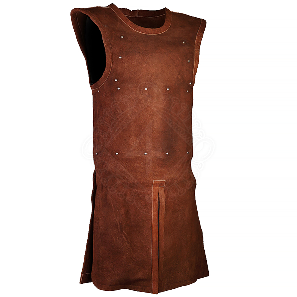 Základem zbroje je pevná semišová kůže, pod kterou jsou nanýtovány ocelové pláty. Tato kombinace ti zajistí solidní ochranu proti úderům. Velkou výhodou tohoto modelu je jeho přizpůsobivost. Díky systému řemenů a přezek na zádech a na bocích si můžeš kabátec utáhnout přesně podle své postavy a vrstev oblečení, které máš pod ním. Spodní část je dělena rozparky, což ti umožní pohodlný pohyb nohou, ať už běžíš do útoku, nebo sedíš v sedle.