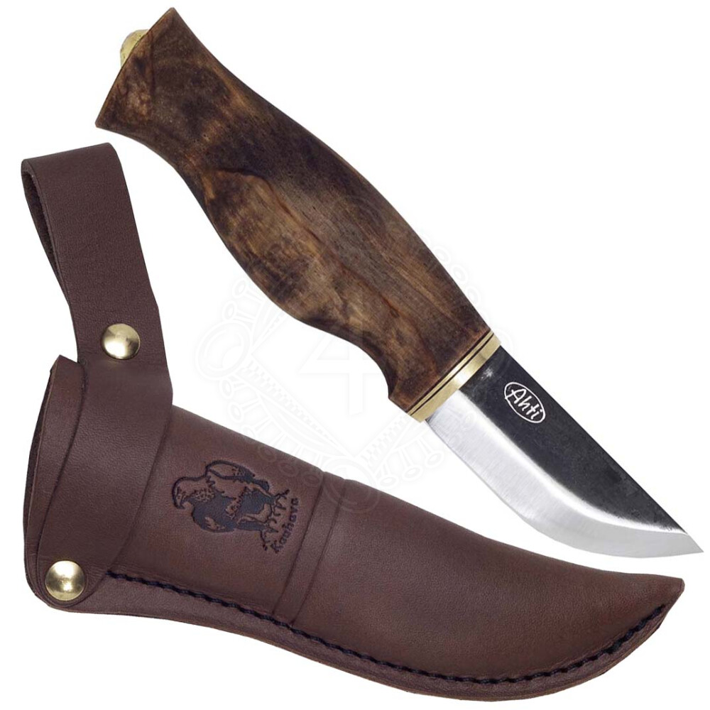 Finský nůž Ahti Kaira (divočina) je ručně vyráběný tradiční nůž z Finska, který vyrábí firma Reine Kamppila & Son. Ahti (také Ahto) je ve finské mytologii bůh moře a rybaření. Čepel je z uhlíkové vanadiové oceli Böhler Uddeholm (ne nerezavějící) o tvrdosti ca 58-59° dle Rockwella. Střenka je vyrobená z mořené břízy a má mosazné kování. Délka čepele je 70mm. Celková délka je 185mm. Více informací k produktu ...